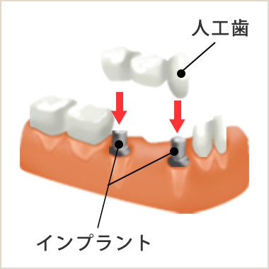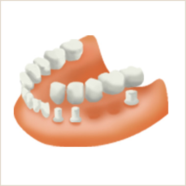 - 部分的に歯を失った場合、隣接する歯を土台に橋渡しをさせて人工の歯を入れる方法です。噛むときの力は土台となる歯だけが受け止めるので、土台となる歯の状態が悪ければ行うことはできません。