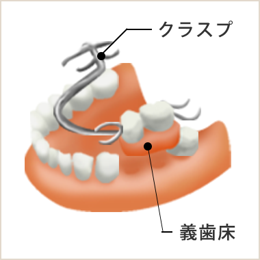 歯を失った部分に人工の歯のついた床をのせ、残った歯にばねを引っ掛けて安定させる方法です。